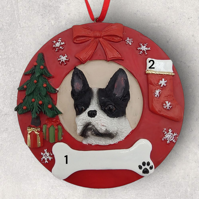 DOGS - BOSTON TERRIER - Red Wreath is backordered and will ship as soon as it is back in stock.