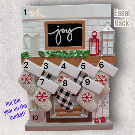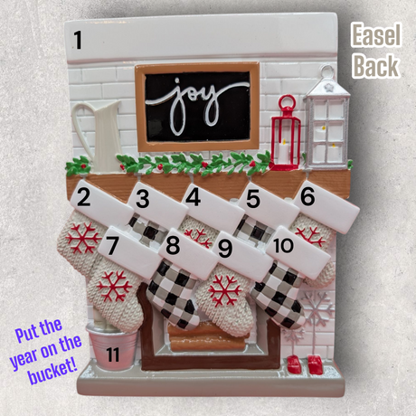 9 STOCKINGS on "JOY" MANTEL TABLE...